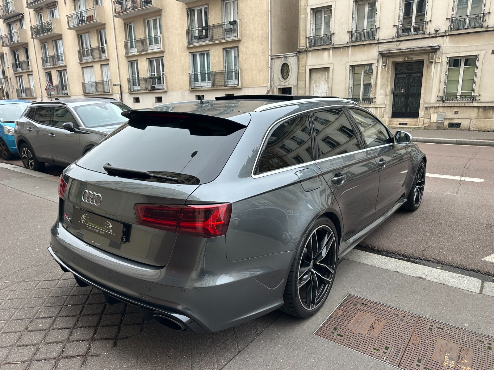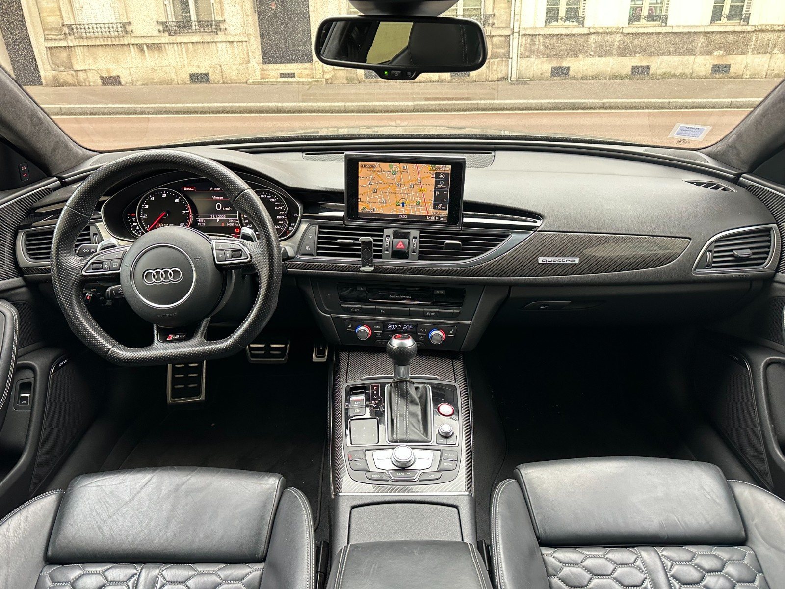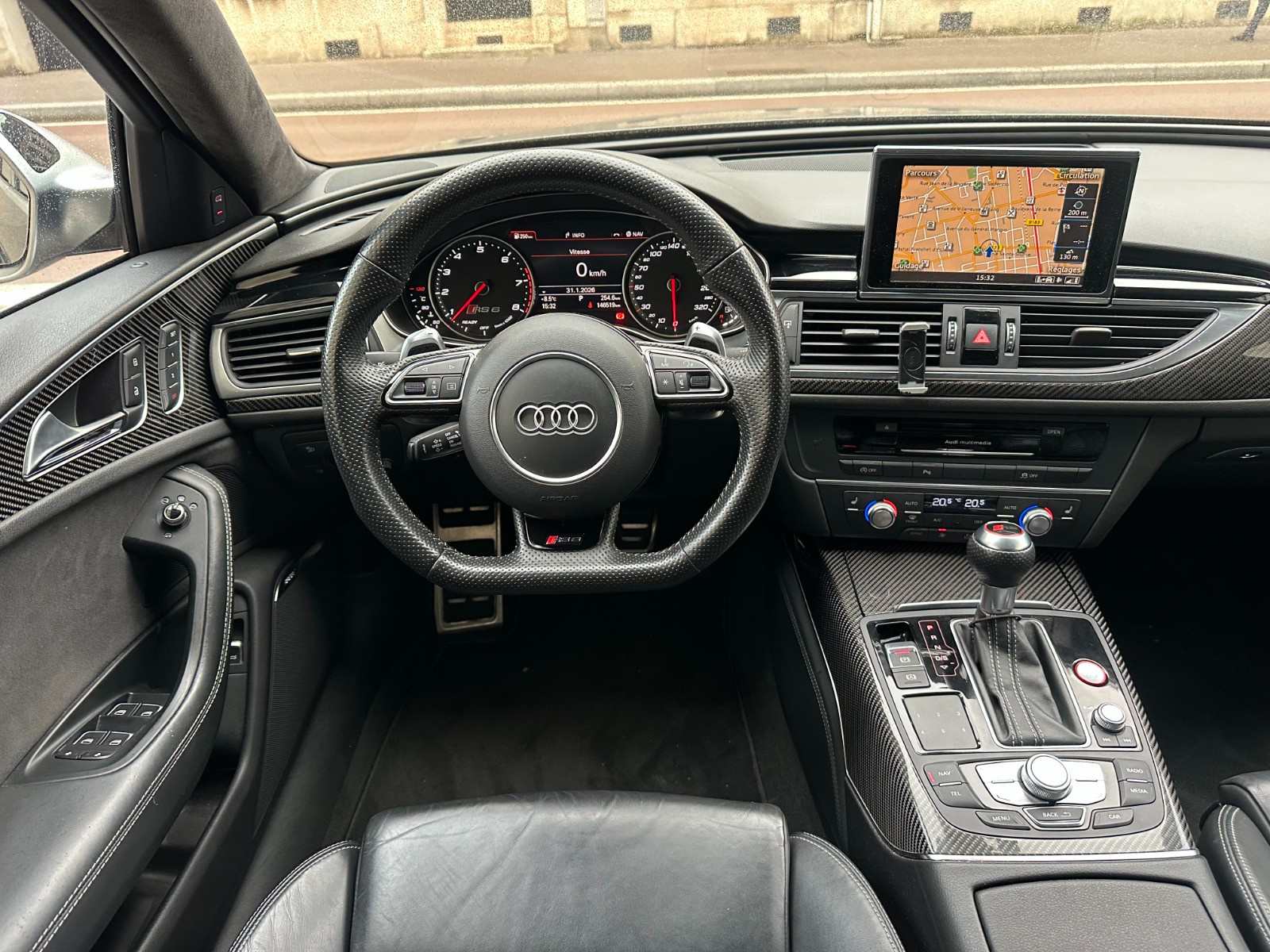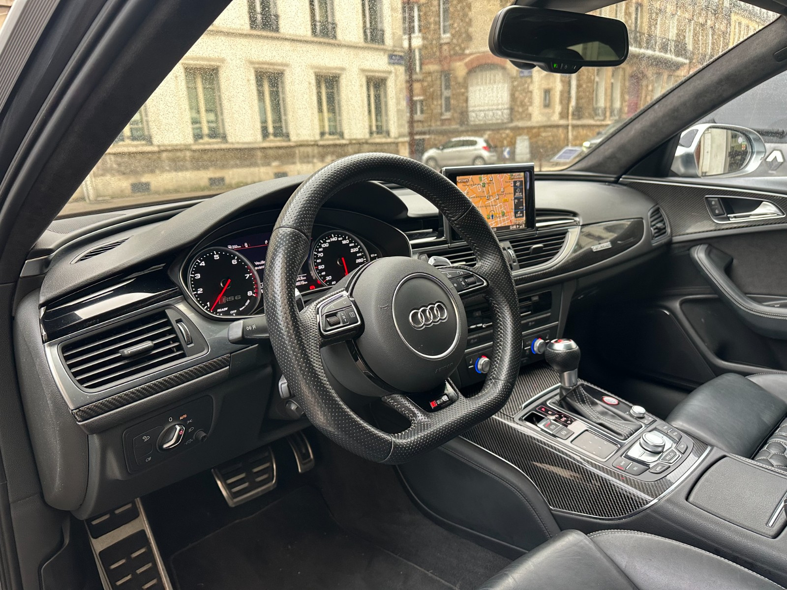 Inscription « RS6 » sur la calandre, le capot de coffre, les étriers de frein AV, le volant Sport en cuir et le tachymètre